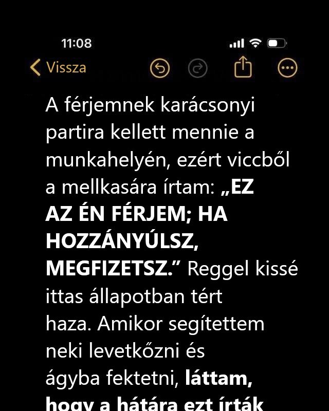 Az egész ártatlan tréfának indult, egy kis karácsonyi poénnak. Írtam egy rövid megjegyzést a férjem mellkasára, mielőtt elment a céges ünnepségre. Nem gondoltam volna, hogy a férjem mellkasára írt üzenet olyan lavinát indít el, ami mindent megváltoztat bennem, a házasságunkról alkotott képemet is.