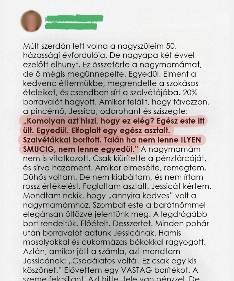 Másnap elmondta, mi történt. Nem akartam posztcunamit, sem jelenetet. Inkább csendben léptem. Foglaltam egy asztalt a saját nevemen, és kértem, hogy Jessica szolgáljon ki. Egy barátomat is elvittem. Elegánsan öltöztünk. Rendeltünk előételt, főételt, desszertet, jó bort, mindent, amitől bőkezű vendégnek tűntünk. Hagytam, hogy végig azt higgye, nagy borravalóra számíthat.