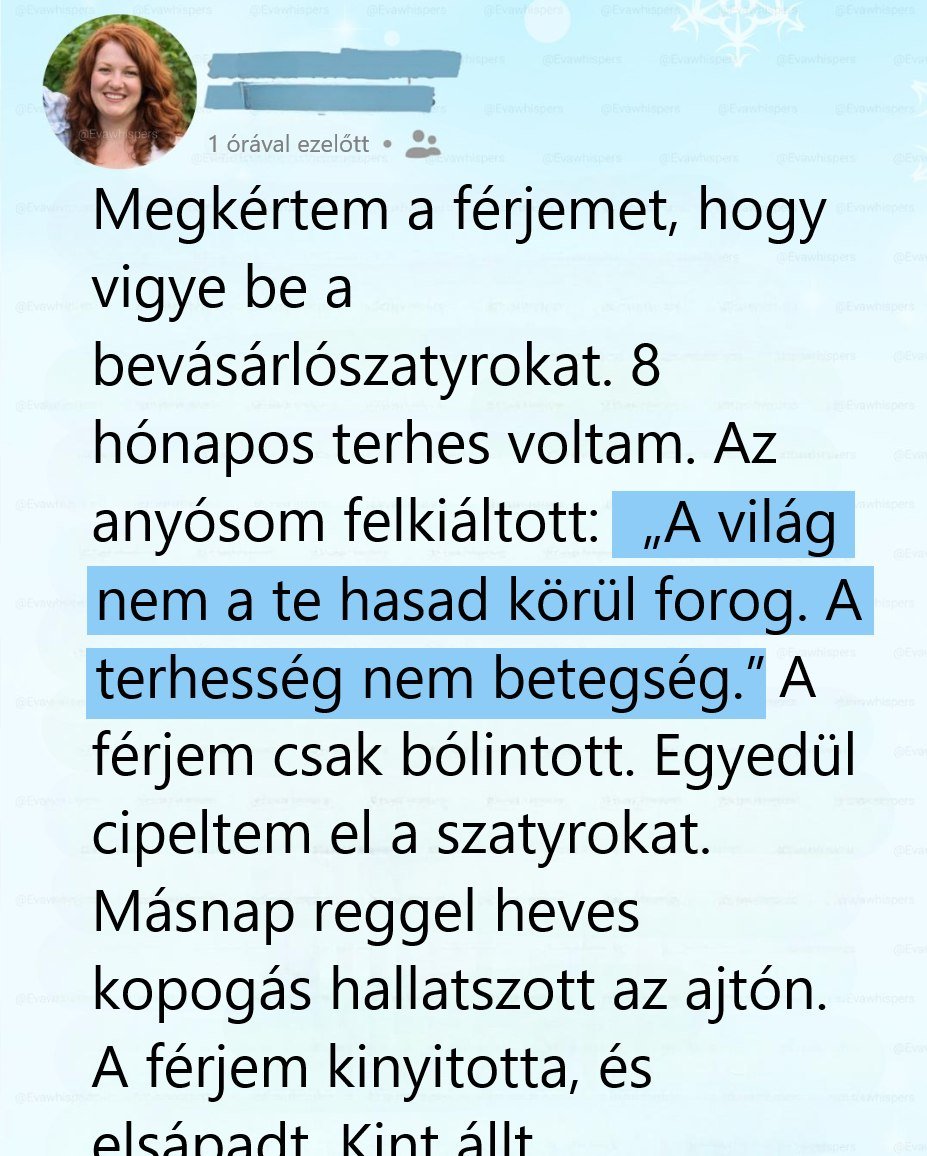 Így aztán fogtam a teli szatyrokat, és egyedül cipeltem be mindent. A karom remegett, a hasam feszült, a lépcső hosszabbnak tűnt, mint valaha. Nem is a bevásárlás volt a legnehezebb, hanem a csend. A férjem csendje, az anyósa lenézése, az a furcsa, üres magány, ami hirtelen rám ült.