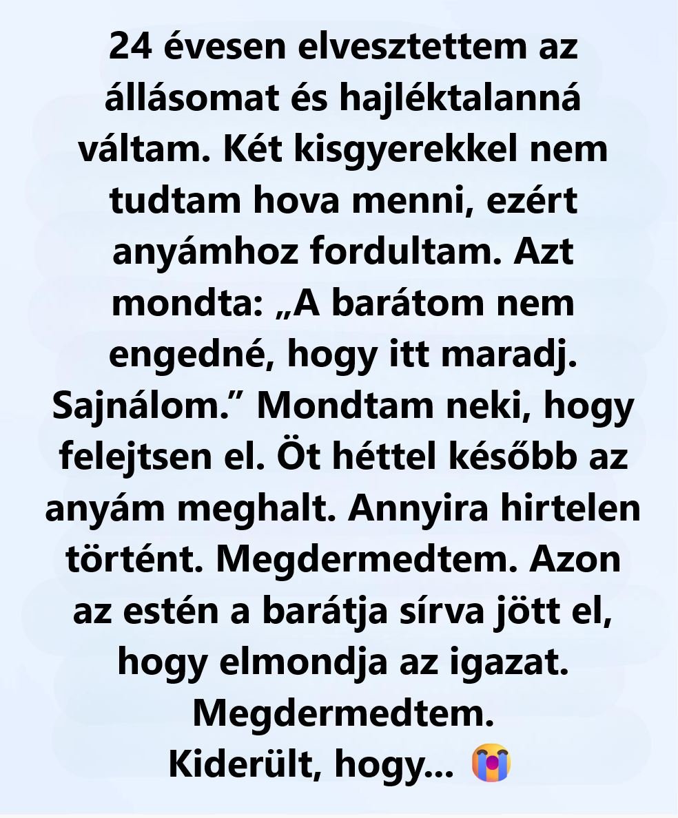 Nem bírtam magamban tartani. Egy levegővel elmondtam mindent. A leépítést. A kilakoltatási papírt. Azt, hogy benzinkutak mosdójában mostunk, és éjszaka lámpák alatt parkoltunk, mert ott kevésbé féltettem a gyerekeket.