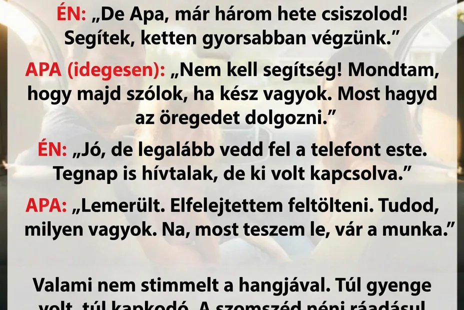 Az elmúlt hetekben gyanúsan viselkedett. Valahányszor menni akartunk a gyerekekkel, mindig volt valami kifogás. „Festek”, „csiszolok”, „nagytakarítást csinálok”. Elhittem, mert Apám világéletében tevékeny volt, nem az a típus, aki a tévé előtt ül. De a telefonbeszélgetéseink rövidek lettek. A hangja fáradt volt, néha mintha levegő után kapkodott volna.
