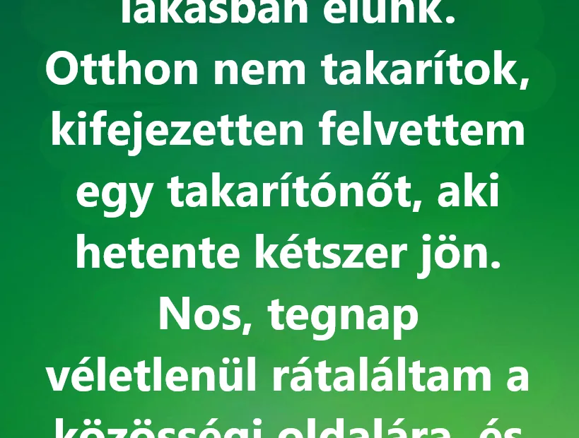 A férjem jól keres, ezért egy világos, tágas lakásban élünk, ahonnan csodás kilátás nyílik a városra. Hetente kétszer megjelenik nálunk a takarítónő – egy csendes, udvarias asszony, aki úgy járja végig a helyiségeket, mint egy enyhe szellő, szinte észrevétlenül. Letöröl minden polcot, gondosan összegyűjti a ruhákat, és alig szól egy halk „Jó reggelt”-nél. Számomra ez csak a mindennapok része volt: valaki, aki megérkezik, kitakarít, aztán távozik.