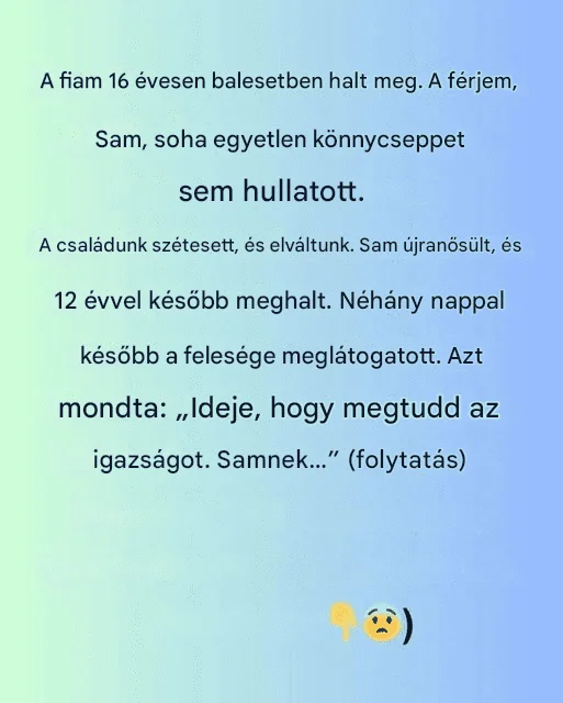 16 éves koromban elvesztettem a fiamat egy tragikus balesetben. Az akkori férjem, Sam, távolságtartó maradt, soha nem mutatott érzelmeket. A családunk nem tudta feldolgozni a veszteséget, és elváltunk. Évekkel később Sam elhunyt. Néhány nappal később a jelenlegi felesége meglátogatott.