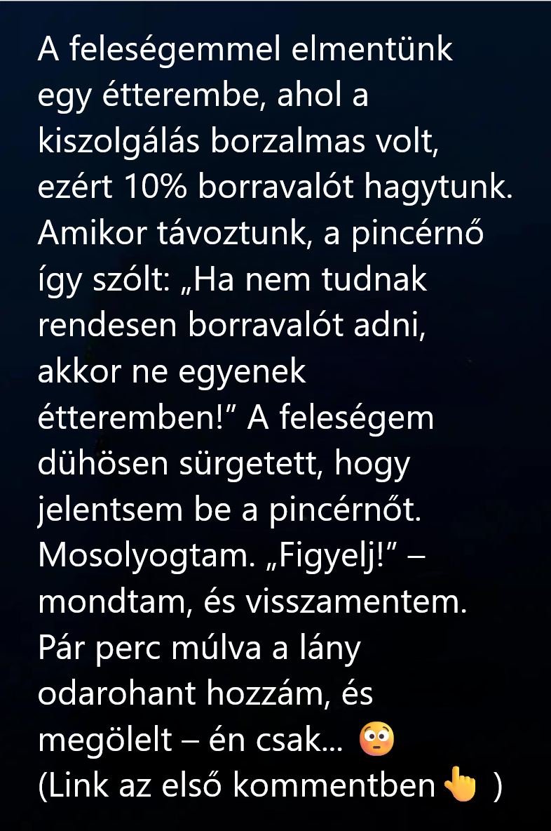 A végén adtam egy 10 százalékos borravalót, majd elindultunk kifelé. Ekkor a pincérnő utánunk szólt, élesen és sértetten: „Ha nem tudnak rendesen borravalót adni, ne járjanak étterembe!”