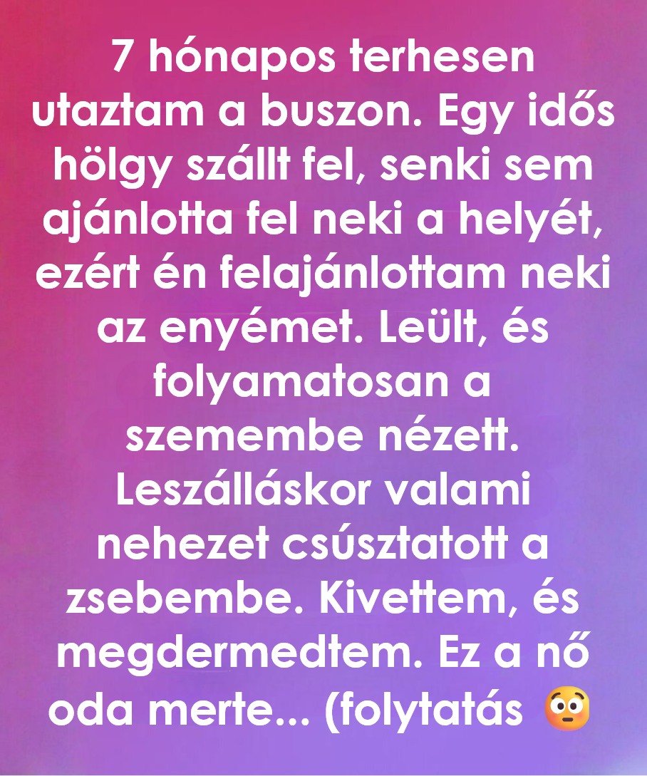 Ekkor egy idős asszony szállt fel. Szorította a táskáját, és helyet keresett a zsúfolt sorok között. Azonnal felálltam, és átadtam neki az ülőhelyemet.