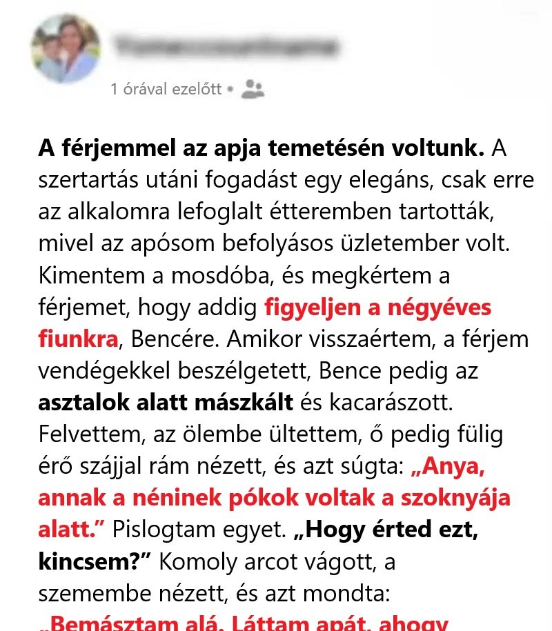 Amíg a fogadáson a felnőttek félmeleg kávé fölött fejezték ki részvétüket, a négyéves fiam, Bence, az asztalok alatt kúszott, teljesen mit sem sejtve arról a fojtott gyászról és feszültségről, ami a teremben lebegett.