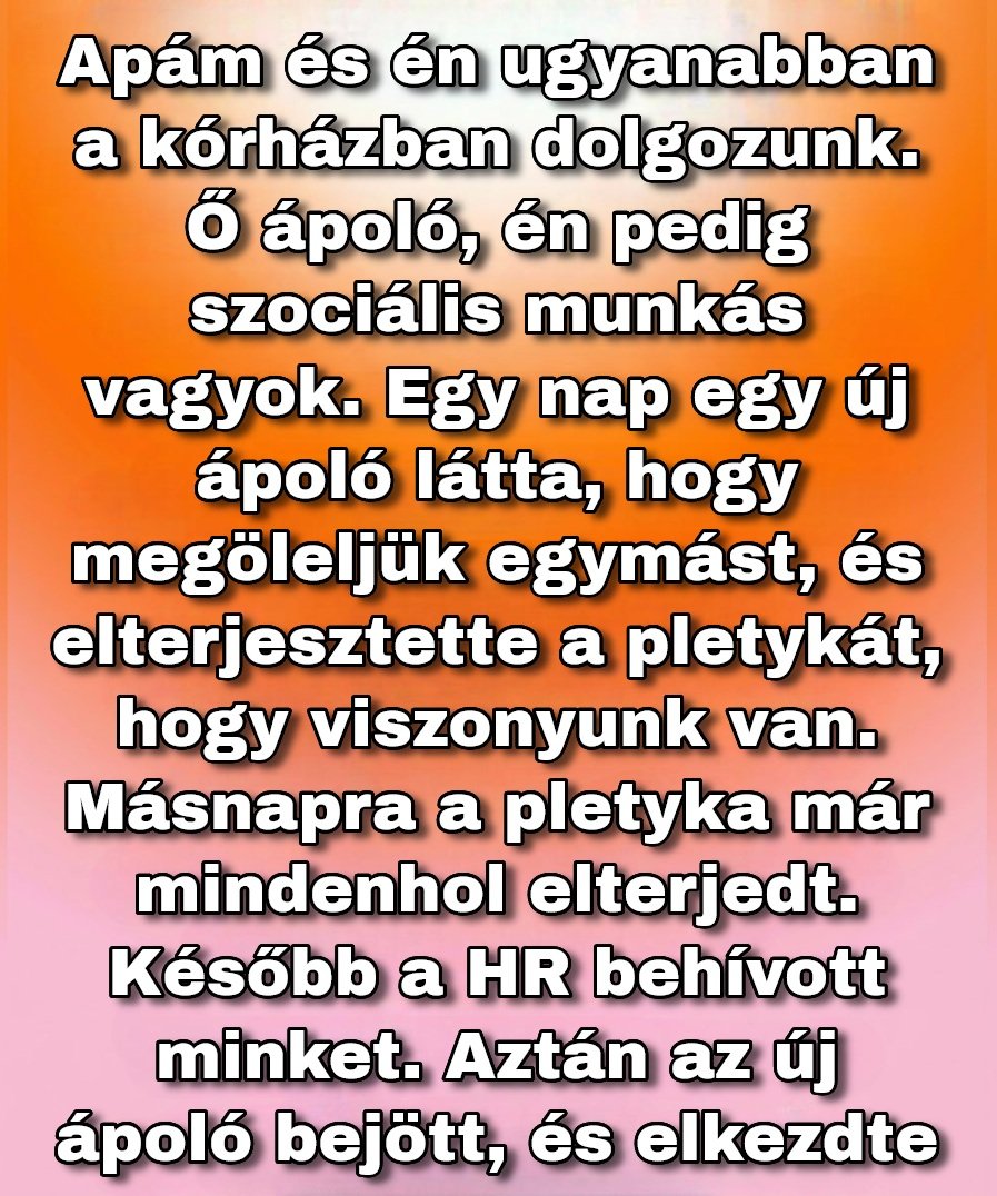 Apám közel 30 éve volt ott ápoló. Sokan tisztelték a nyugodt jelenlétéért, a biztos kezéért, és a száraz humoráért, amivel gyakran oldotta a betegek feszültségét. Én a szociális területen dolgoztam, családoknak segítettem eligazodni a diagnózisok, papírok, és nehéz döntések között. Ritkán találkoztunk, mert eltértek a beosztásaink. Amikor mégis összefutottunk a folyosón, adtunk egymásnak egy gyors ölelést. Semmi nagy jelenet, csak egy rövid jelzés, hogy minden rendben van.