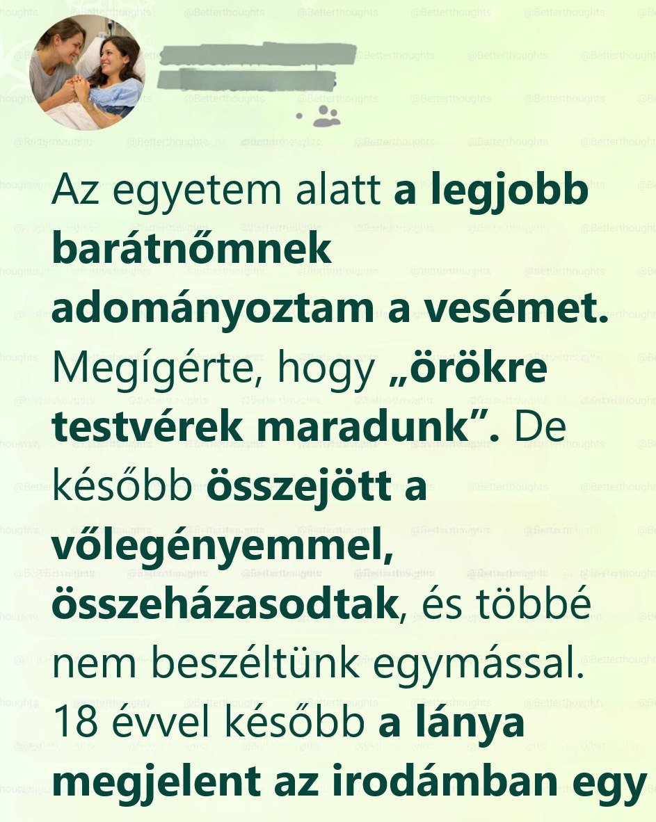 Melissa volt a neve, és már gólyatábor óta összenőttünk. Együtt tanultunk, késő esti pizzákat ettünk a koliban, sírtunk a vizsgák után, és órákig beszéltünk arról, milyen életet akarunk. Amikor húszévesen veseelégtelenséget diagnosztizáltak nála, az orvosok azt mondták, éveket is várhat transzplantációra.