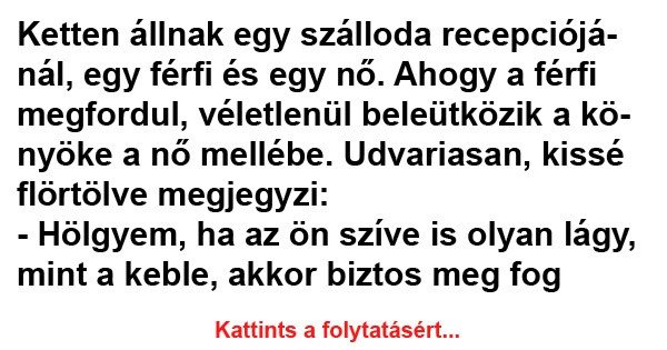 Ketten állnak egy szálloda recepciójánál, egy férfi és egy nő. Ahogy a férfi megfordul, véletlenül beleütközik a könyöke a nő mellébe. Udvariasan, kissé flörtölve megjegyzi: