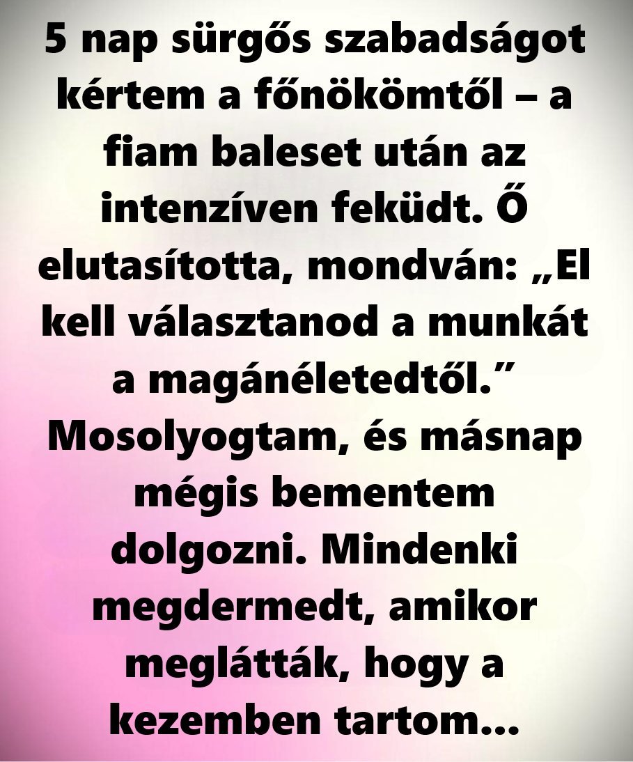 A fiamat hirtelen baleset miatt szállították kórházba, én pedig öt nap azonnali szabadságot kértem a főnökömtől. Elutasította, és hideg hangon emlékeztetett, hogy „a munkát és a magánéletet szét kell választani”. Ott és akkor vitázhattam volna, vagy egyszerűen kisétálhattam. De a kimerültség néha kegyetlenül tisztán megmutatja, mi számít igazán. Másnap mégis visszamentem, nem engedelmességből, inkább csendes eltökéltségből.