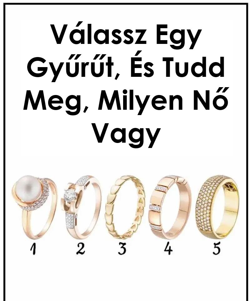 Nézd meg az öt gyűrűt a fenti képen, és válaszd ki azt, amelyik rögtön megfogott. Ne gondolkodj rajta túl sokat, döntsd el, melyik illik leginkább hozzád. Ha megvan az ékszer, olvasd el a leírást, és fedezd fel, mit árul el rólad a döntésed.