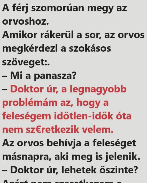 – Doktor úr, a legnagyobb problémám az, hogy a feleségem időtlen-idők óta nem szeretkezik velem.