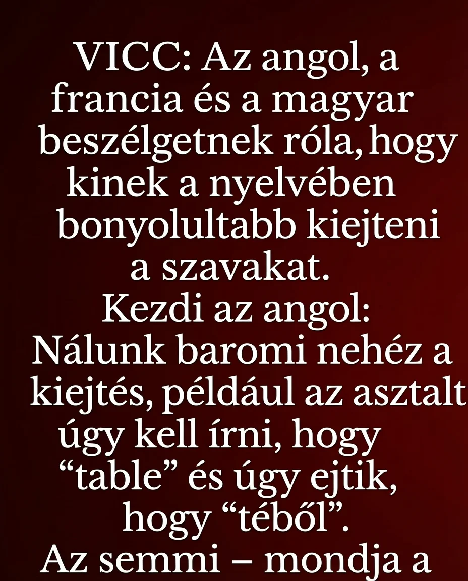 Az angol, a francia és a magyar beszélgetnek róla, hogy kinek a nyelvében bonyolultabb kiejteni a szavakat.