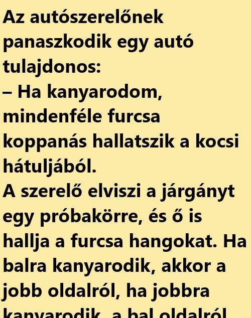 – Uram, szerintem azonnal meg fog szűnni a kopogás, ha kiveszi a csomagtartóból a tekegolyót.