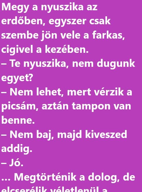 Megy a nyuszika az erdőben, egyszer csak szembe jön vele a farkas, cigivel a kezében.